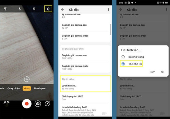 ► Nếu bộ nhớ trong đã đầy và bạn không thể tiến hành dọn dẹp, bạn hãy thiết lập lưu ảnh ở thẻ nhớ SD. Với ảnh chụp từ camera, bạn hãy vào Camera => Nhấn chọn biểu tượng Cài đặt => Chọn vị trí lưu là thẻ nhớ SD. Với ảnh được tải về Internet hoặc ứng dụng khác, bạn cần tiến hành thiết lập ở phần Cài đặt của trình duyệt hoặc phần Cài đặt của từng ứng dụng.